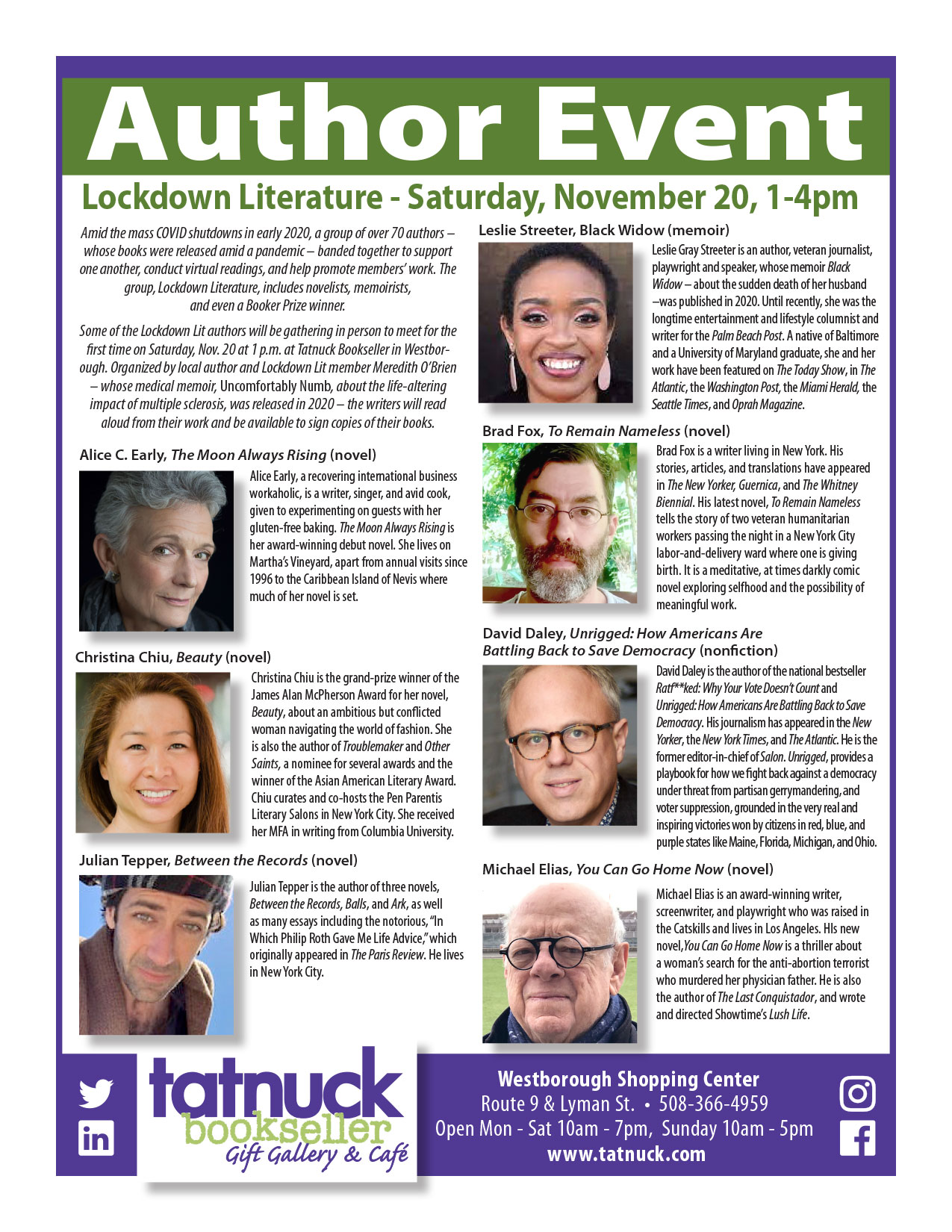 I was incredibly honored to arrange to have some Lockdown Lit folks gather — just prior to the omicron COVID-19 surge — gather and read aloud from their work at Tatnuck Bookseller. Those talented writers included: