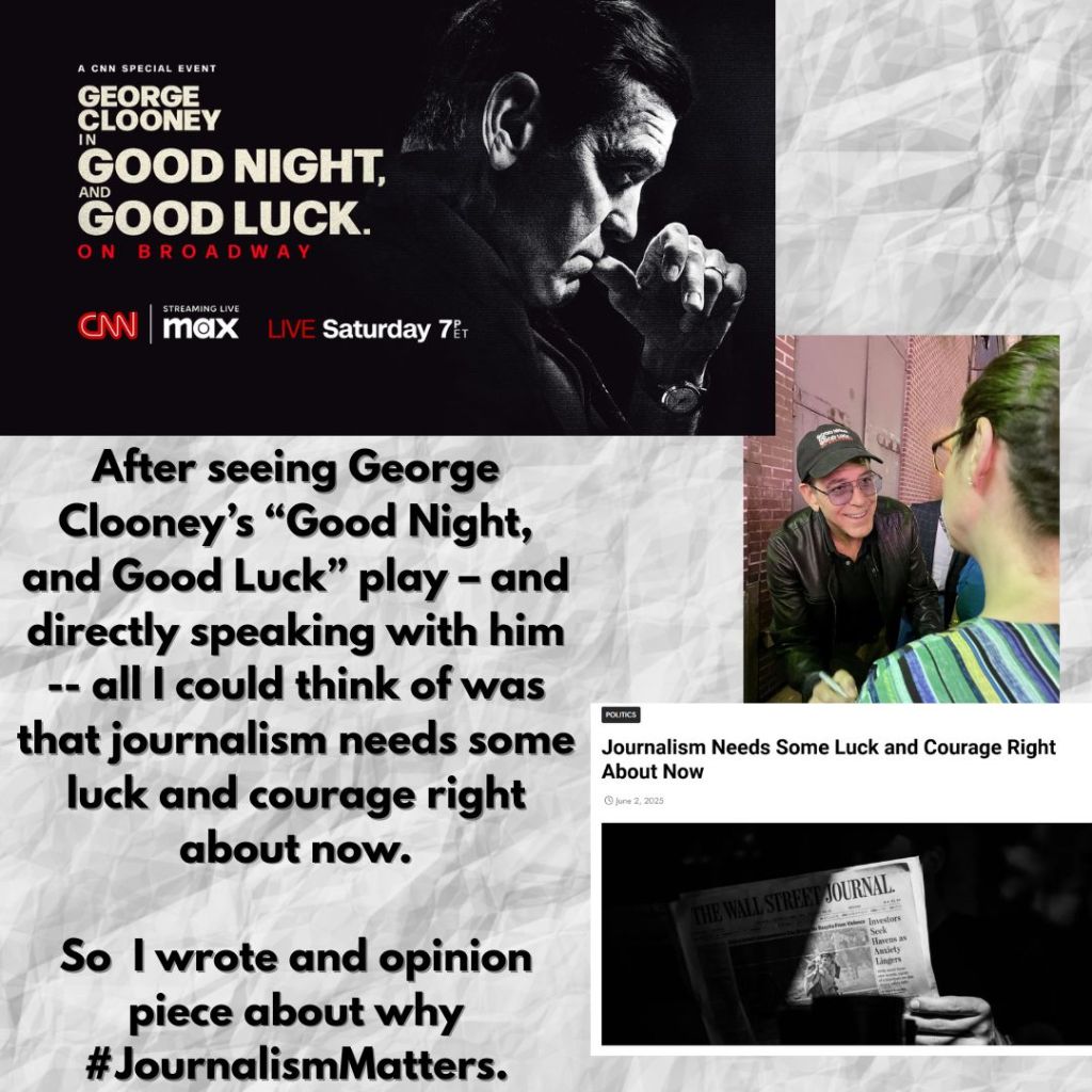 It was inspired by watching Tony-nominated actor George Clooney who I met in New York City after seeing his phenomenal play, Good Night, and Good Luck, about how a CBS journalist, Edward R. Murrow, sacrificed his career in order to speak truth to and about U.S. Sen. McCarthy.