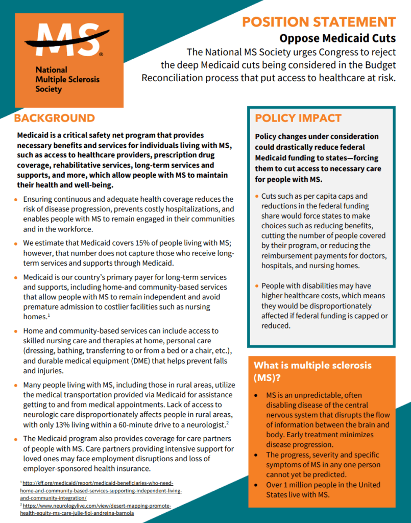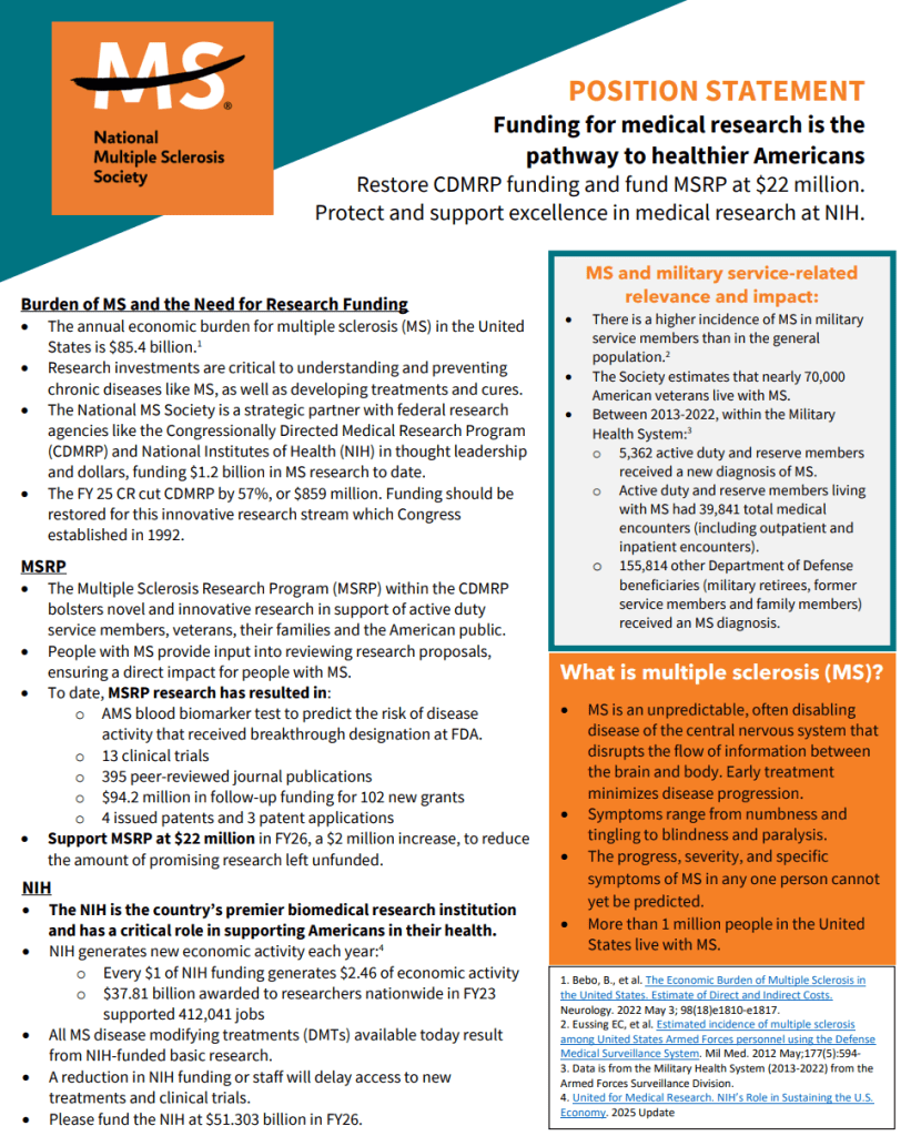 In March 2025, I attended the Society’s three-day Public Policy Conference in Washington, D.C. which culminated with visits to Capitol Hill to discuss with our members of Congress two issues: the restoration of funds for Congressionally-Directed Medical Research for Multiple Sclerosis (MSMR) and requesting that our elected officials reject deep cuts to Medicaid on which over 15 percent of MS patients rely.